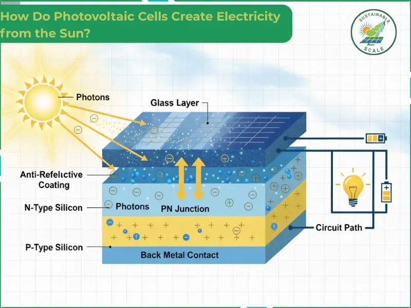The image below illustrates how photovoltaic cells generate electricity from sunlight.