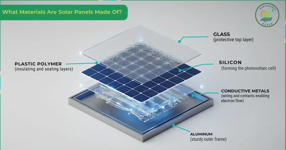 Solar panels are mainly made from silicon, glass, aluminum, copper, and plastic polymers. Silicon converts sunlight into electricity, while glass protects the cells and lets light in. Aluminum frames support the panel, copper wiring carries the electricity, and plastic polymers seal and protect the cells. Small amounts of silver are used for electrical contacts, and sealants keep out moisture.